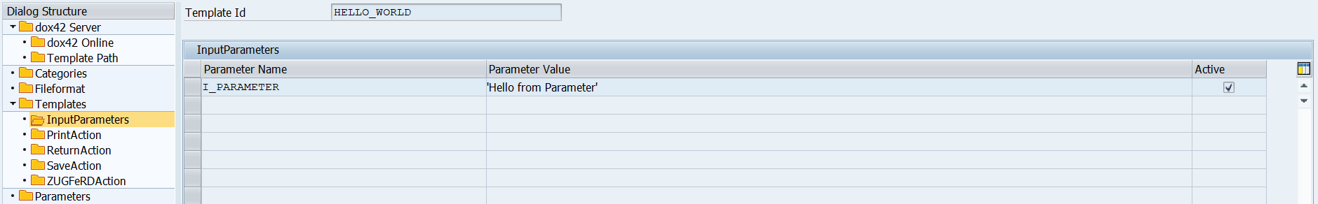 All available input parameters for a template (stored on the dox42 Server) are configured in the InputParameters subnode.