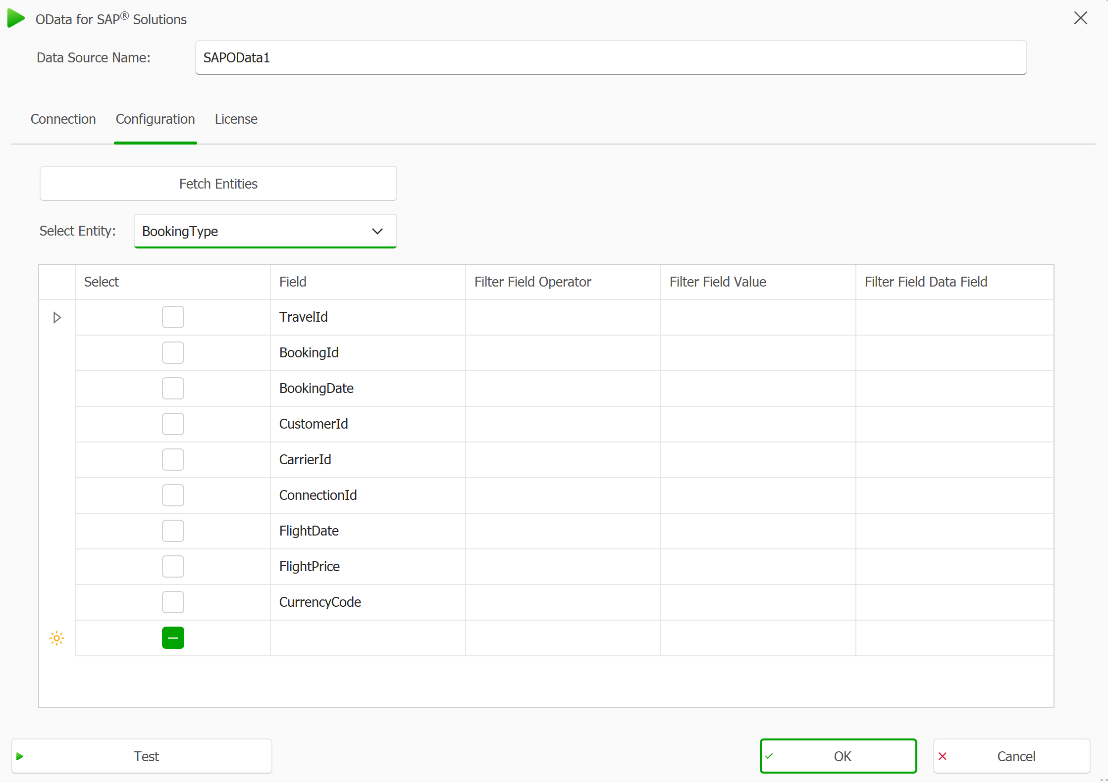 In this step, you will fetch available data entities from your connected SAP OData server. This action retrieves the structure of the data exposed by the OData service, allowing you to select specific entities for further use in your document or report.